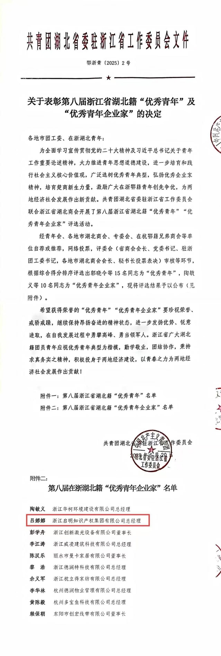 近日,第八屆浙江省湖北籍“優(yōu)秀青年”及“優(yōu)秀青年企業(yè)家”評選結(jié)果正式揭曉,我司總經(jīng)理呂娜娜榮獲浙江省湖北籍“優(yōu)秀青年企業(yè)家”稱號。